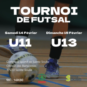 ⚽ Tournoi de Futsal à Sainte-Soulle ⚽ 📅 Samedi 14 février : U11 📅 Dimanche 15 février : U13 🕘 De 9h à 16h30 📍 Complexe sportif de Sainte-Soulle : Chemin des Barbionnes