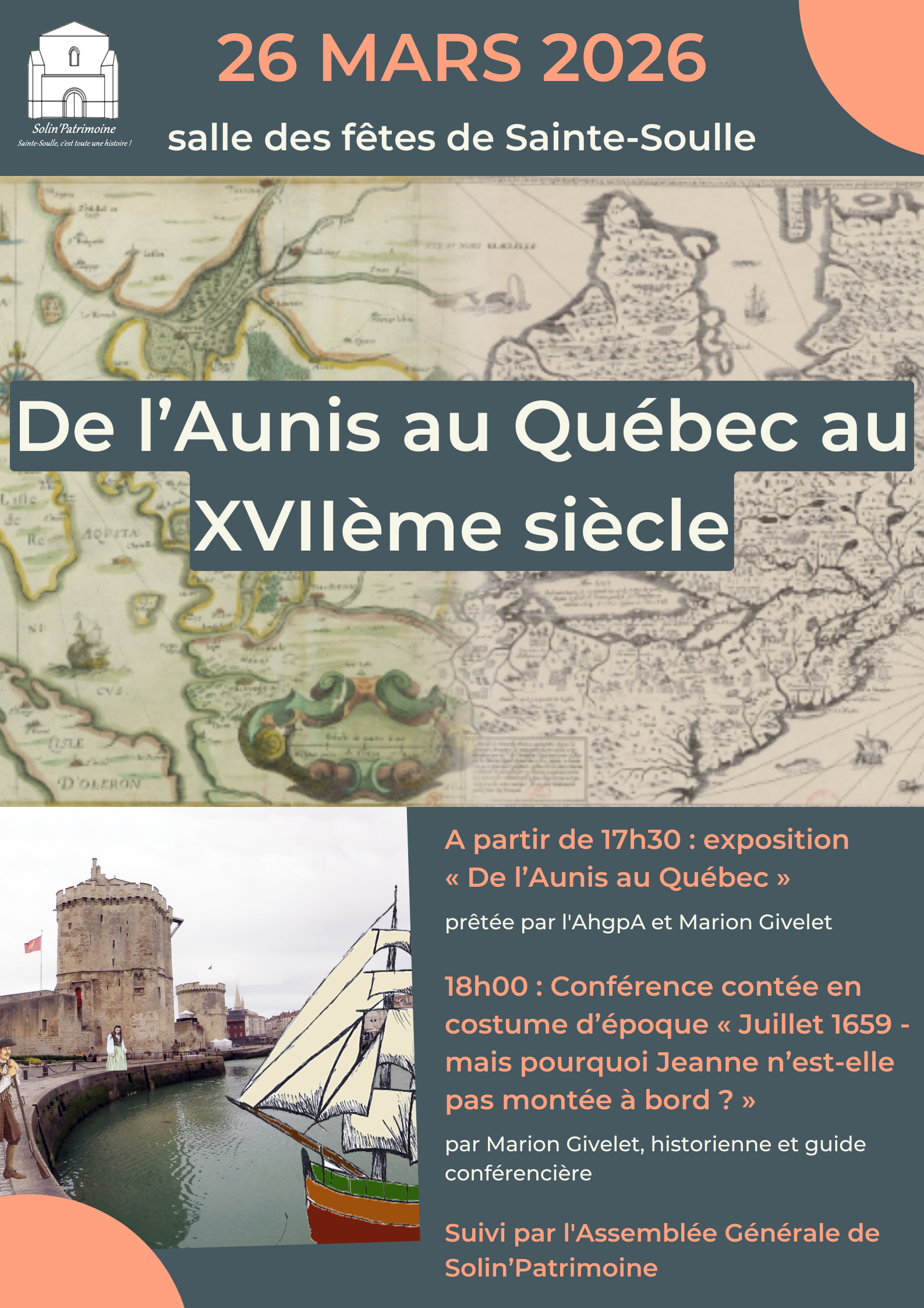 Mme Marion Givelet (historienne et guide conférencière) interviendra sous forme de «  Conférence contée »  ou saynète en costume d’époque. De plus elle apportera des documents que nous exposerons en plus de l’exposition « De l’Aunis au Québec » prêtée par l’AhgpA.