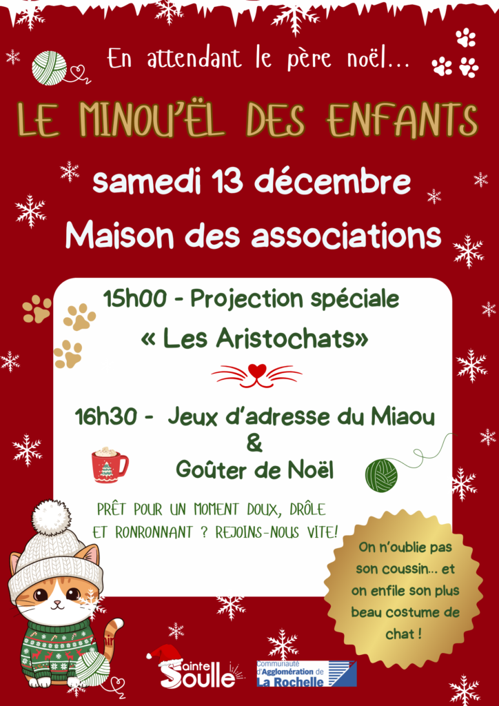En attendant l’arrivée du Père Noël, la commune de Sainte-Soulle invite petits et grands enfants à participer au Minou’ël des Enfants, un après-midi chaleureux et festif placé sous le signe des chats. L’évènement se déroulera le samedi 13 décembre à la Maison des Associations.