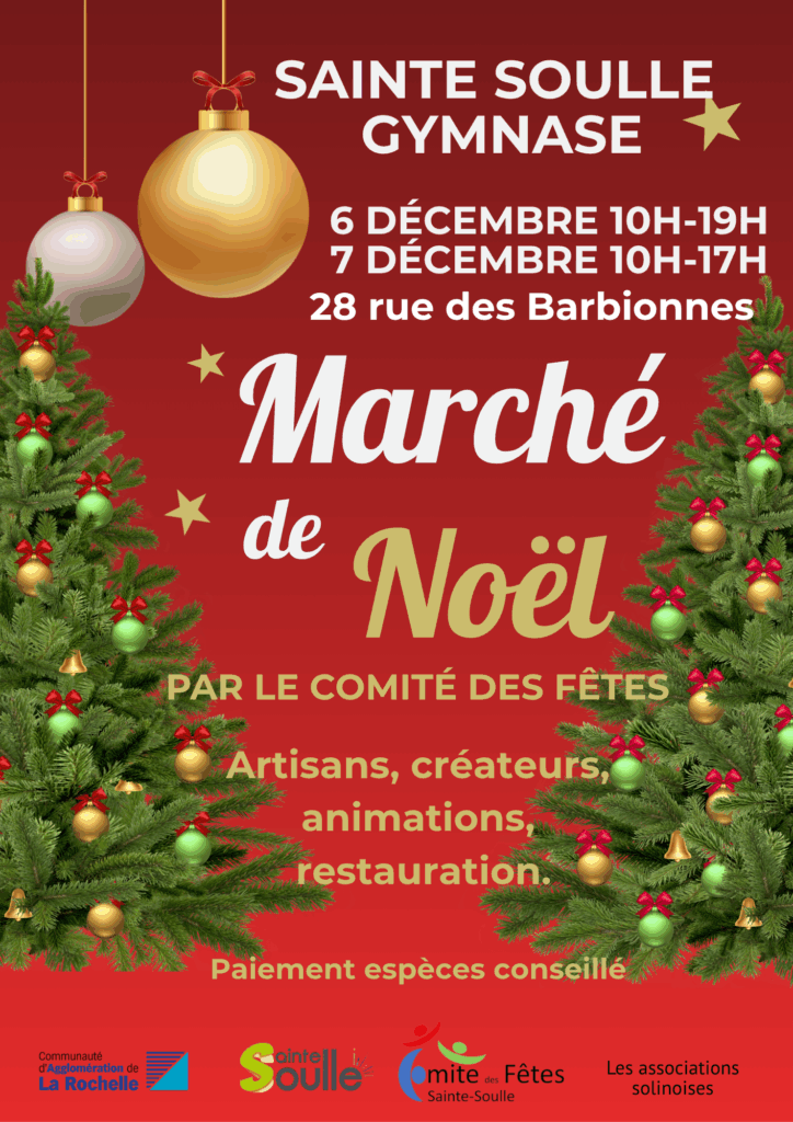 Le Comité des fêtes de Sainte-Soulle vous donne rendez-vous pour son traditionnel marché de Noël, les samedi 6 décembre de 10h à 19h et dimanche 7 décembre de 10h à 17h, au gymnase de la commune.